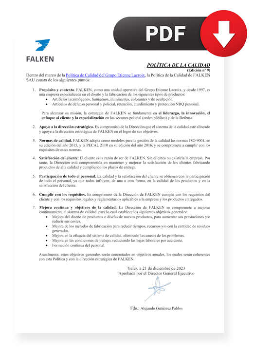 Desde una perspectiva de calidad y gobernanza, FALKEN documenta una política de calidad donde se posiciona como unidad operativa del Grupo Étienne Lacroix y describe su especialización en el diseño y fabricación de diferentes familias de productos vinculados a control y señalización (p. ej., Espray Pimienta).